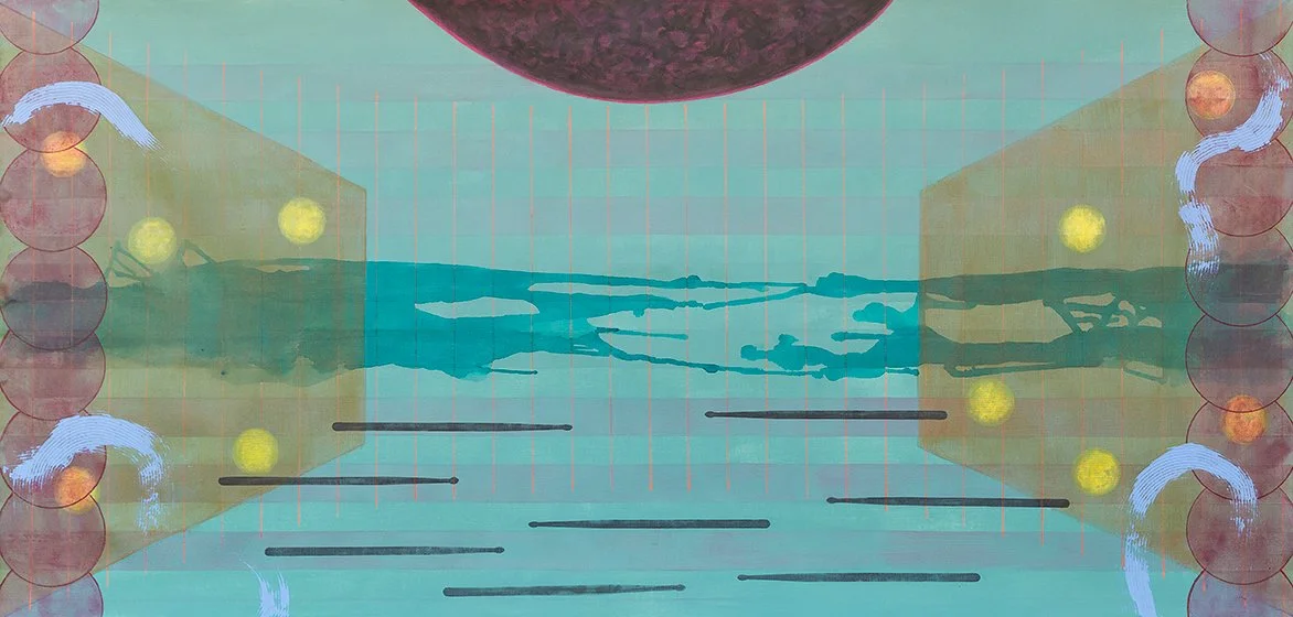 The centrepiece of the exhibition is ‘Cross Rhythmic Delay’, 2017. The paintings from this series act as ‘cartographic depictions, un-fixed graphics scores and celestial constellations’. On both the left and right of the image are circular and geometric forms with an ocean-like void in the centre. The two sides of the painting are connected by a series of musical stave-like vertical lines, washes and layers of paint and a series of drumsticks that allude to the Black bodies, whose remains constitute the bed of the ocean. The painting in part captures the flow of sonic energy between Africa and the Americas, and depicts the cyclical nature of the movement of music. At the upper centre of the work is a planet pertaining to a reimagined utopian world of ideals. The paintings speak of both geographic and spiritual transit. Multiple transitions which span abduction, racial hybridisation, gender, and spiritual resolve.